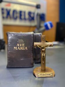 Os brindes incluem um crucifixo de mesa de 12 centímetros e duas bíblias Ave Maria, edição de bolso com capa de couro e zíper.